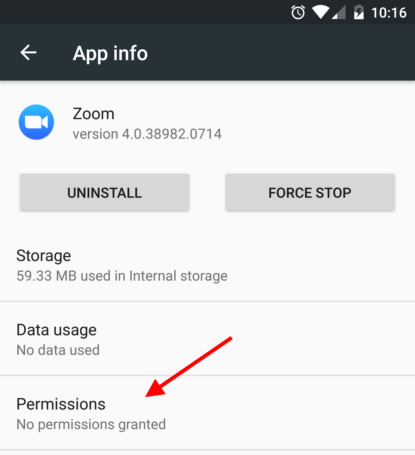 The instructions below use screencaps taken from Android 6.0 (Marshmallow). If your Android version varies widely, it may be fastest for you to uninstall and reinstall Zoom and re-enter the meeting instead, so that you are prompted again to provide permission to access the camera/microphone.