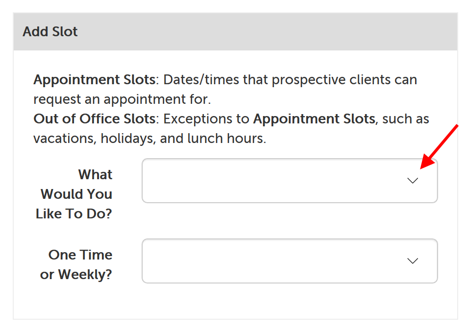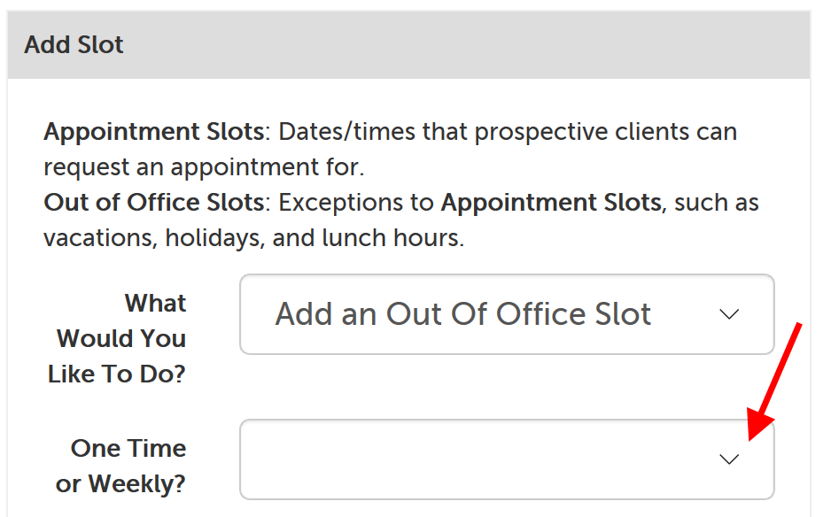 2. Click on the dropdown next to "What Would You Like To Do?" and select "Add an Out of Office Slot".