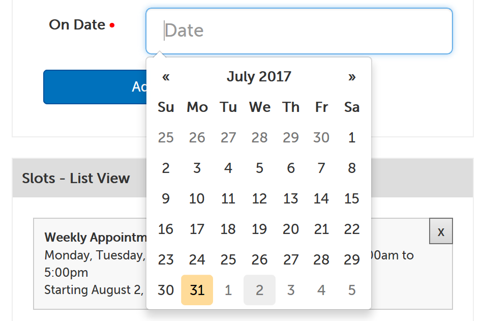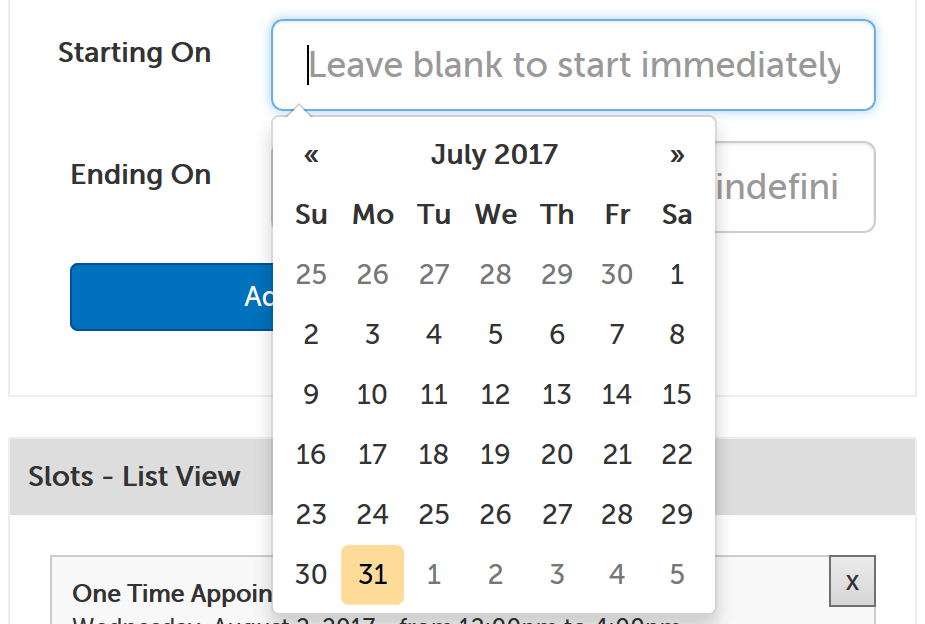 7. Click on the "Starting On" field to make the datepicker appear, and select the date the out of office slot should start on. (Leave blank to start immediately.)