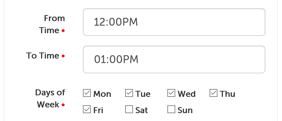 4. Click on the "From Time" field to have the timepick appear. Click a starting hour and then select minute value, in your account's time zone. Click "AM" or "PM" to indicate which is applicable.