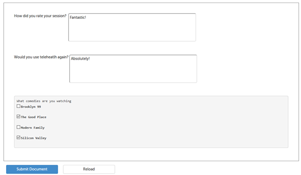 The MetaData returned in the example Document JSON above would have been generated using two steps. First, the MetaData property names "Session Rating", "Use Telehealth Again", and "What comedies are you watching" are defined when editing the Document Template: