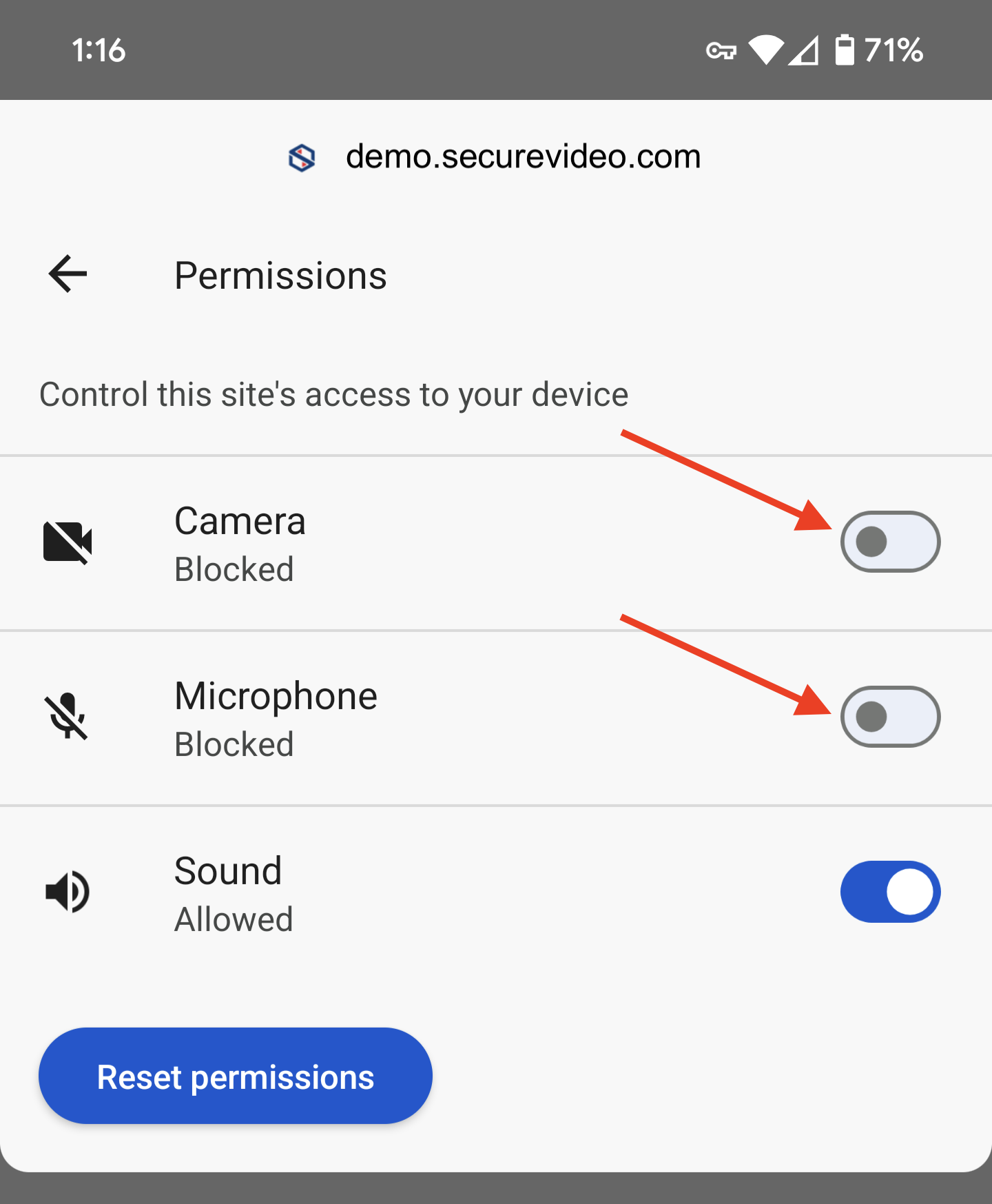 Arrows pointing at the grayed out toggles for camera and microphone permission